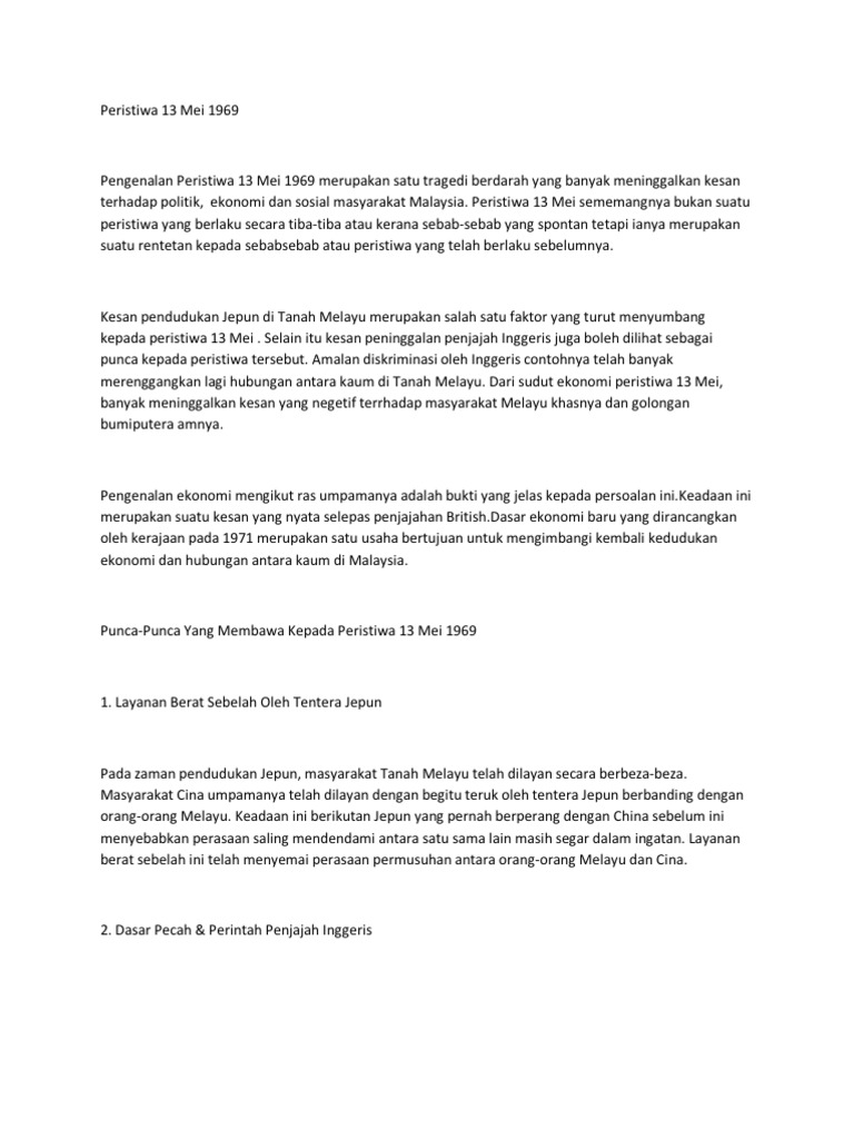 Bahasa Kebangsaan kedudukan istimewa orang Melayu dan hak kerakyatan orang bukan Melayu. Peristiwa 13 Mei 1969 adalah satu rentetan kepada sebab-sebab atau peristiwa yang telah berlaku sebelumnya. PERISTIWA 13 MEI 1969 was published by farhan isa on 2020-03-09.